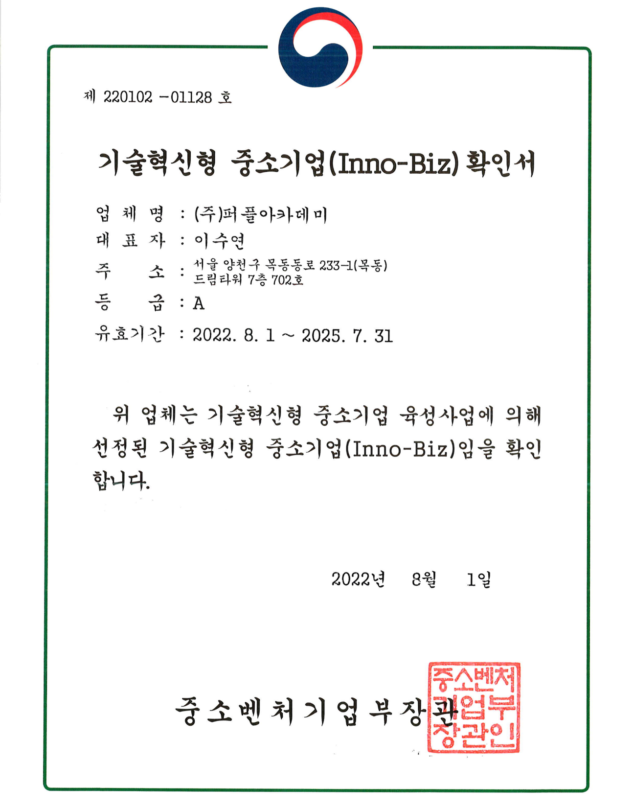 퍼플아카데미가 지금까지 이뤄낸 기술혁신 및 가치혁신을 인정받아 기술혁신형 중소기업(Inno-Biz) 인증을 받았습니다.
