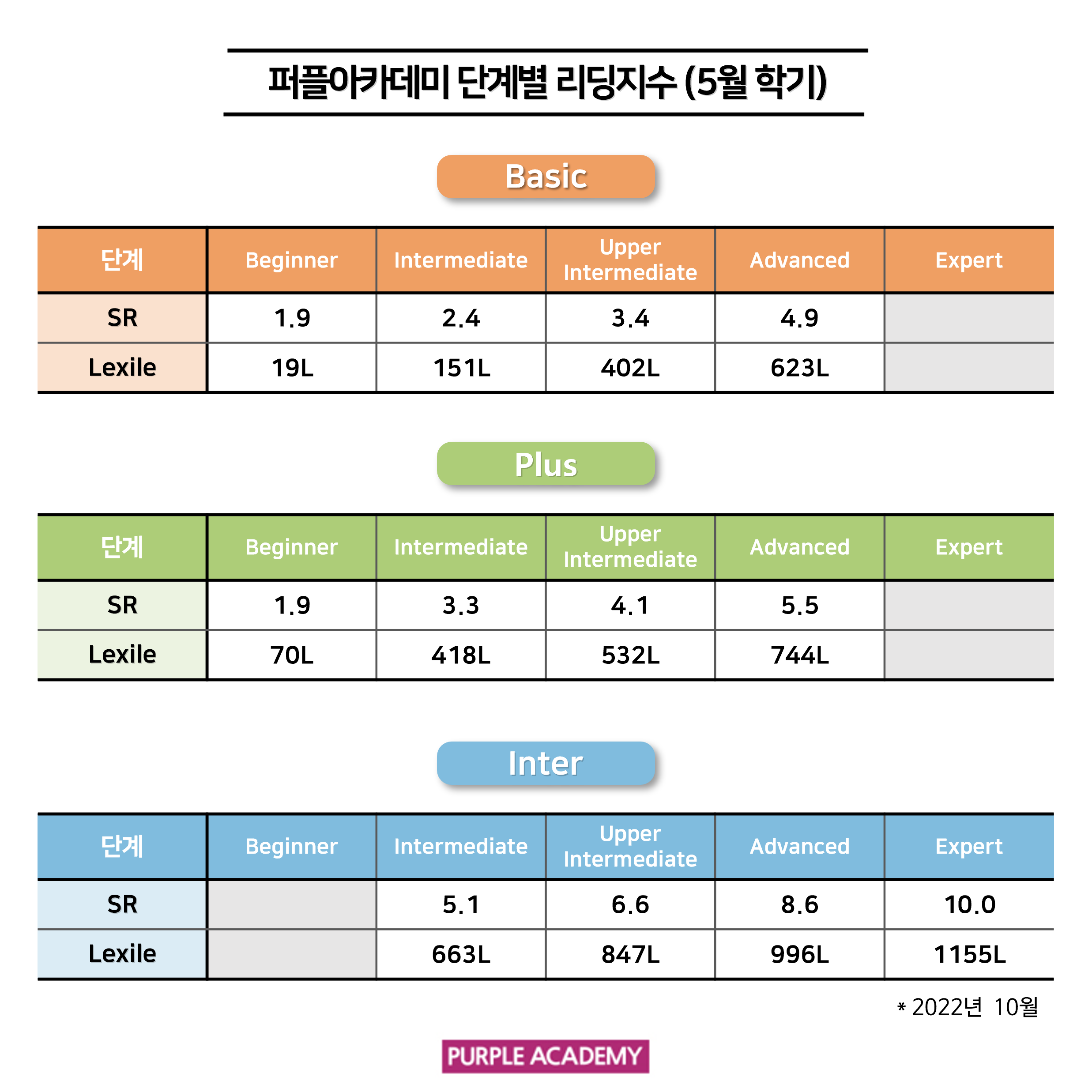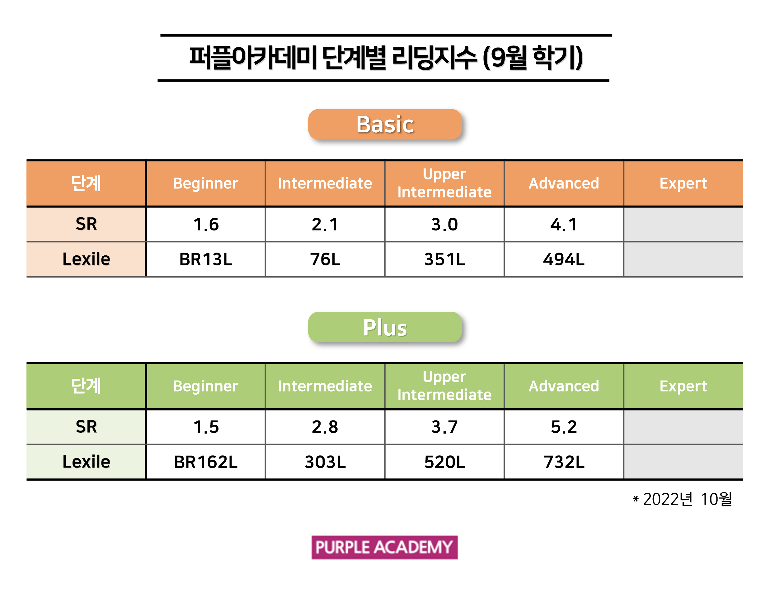 퍼플 Kids의 학기별, 단계별 2022년 10월 리딩 지수를 공개합니다!