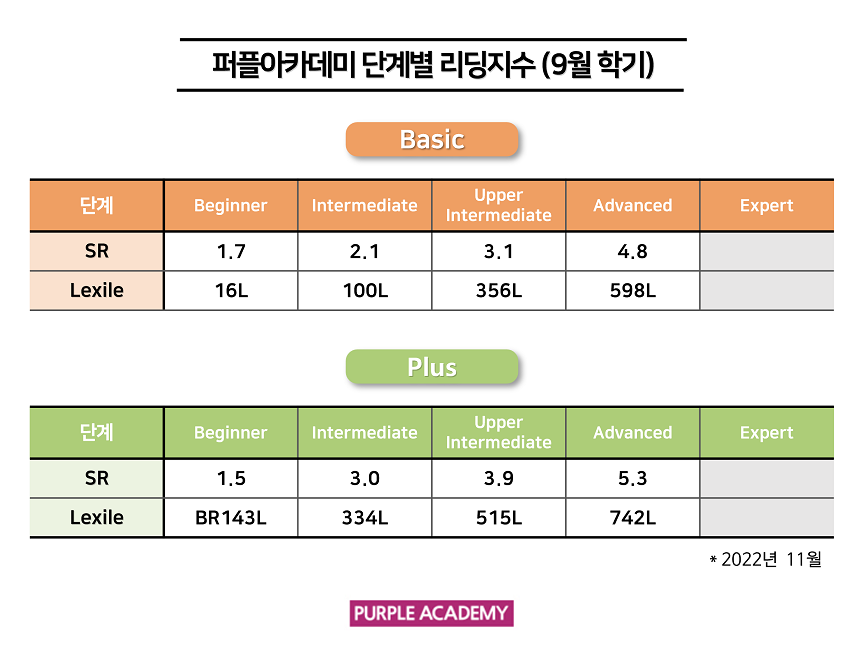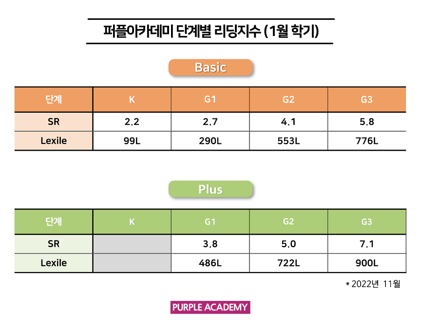 퍼플 Kids의 학기별, 단계별 2022년 11월 리딩 지수를 공개합니다!
