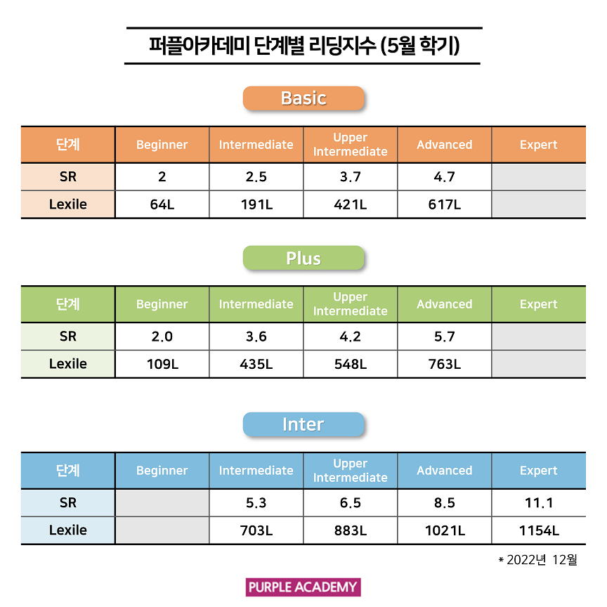 퍼플 Kids의 학기별, 단계별 2022년 12월 리딩 지수를 공개합니다!