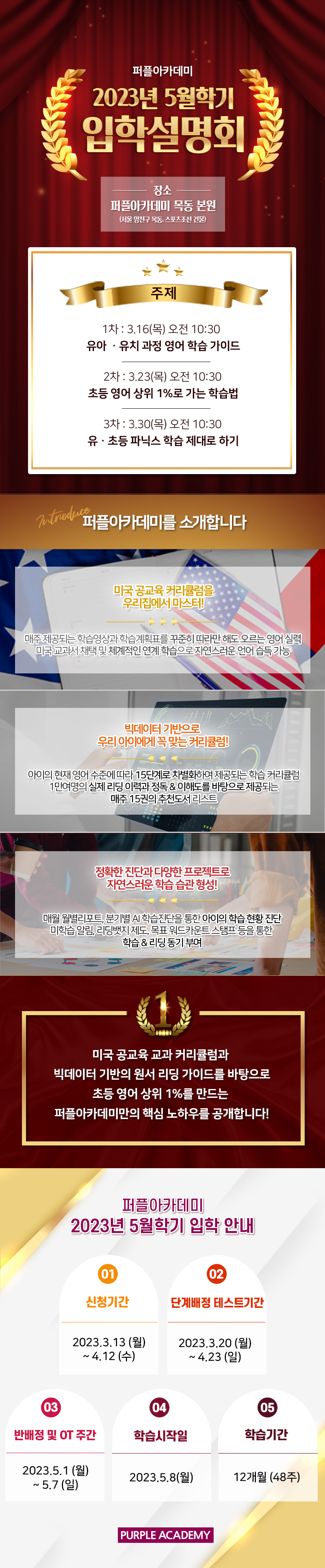퍼플아카데미 2023년 5월학기 신입생 모집을 맞아 ★영어 홈스쿨 핵심 노하우★를 담은 오프라인 특강을 실시합니다.