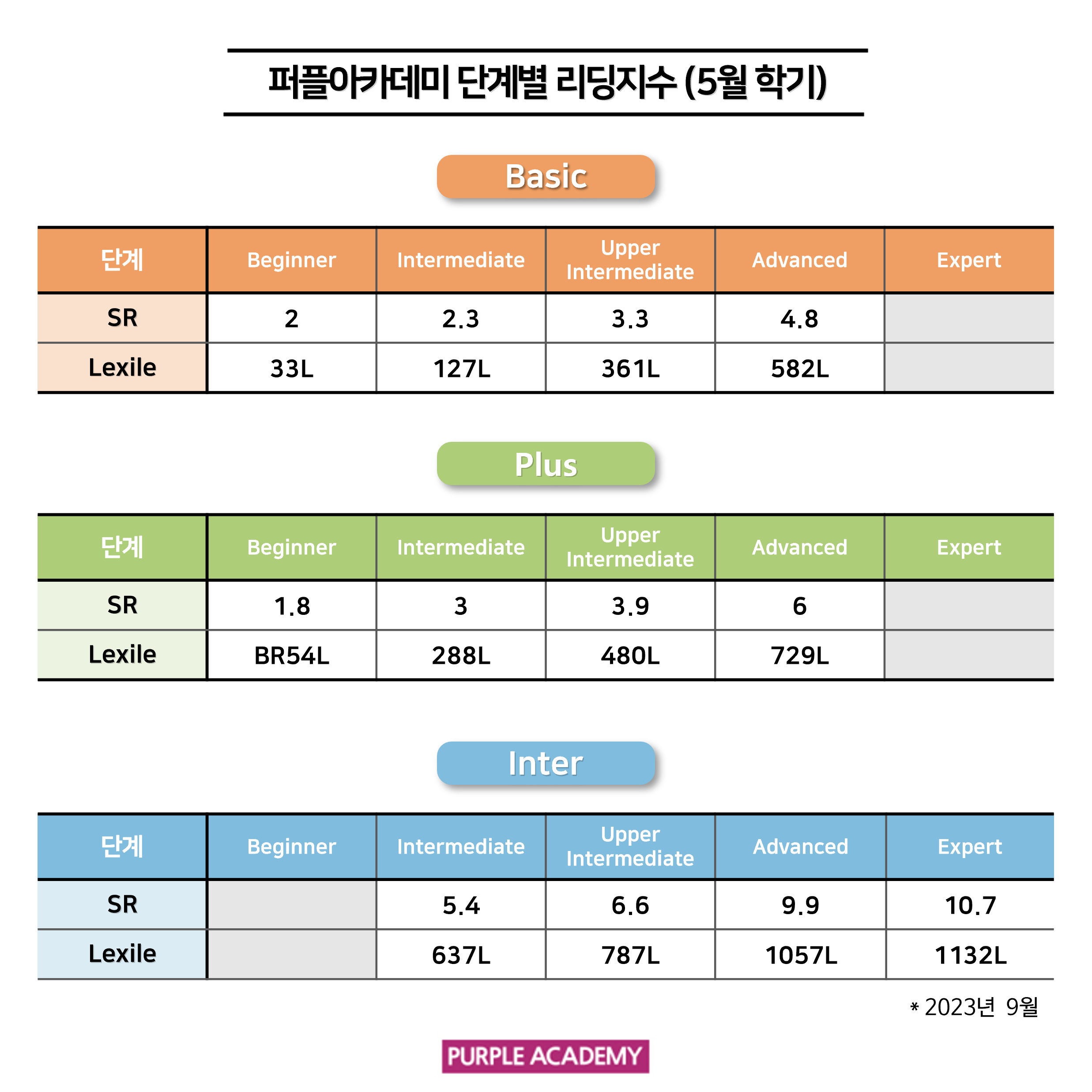 퍼플 Kids의 학기별, 단계별 2023년 9월 리딩 지수를 공개합니다!