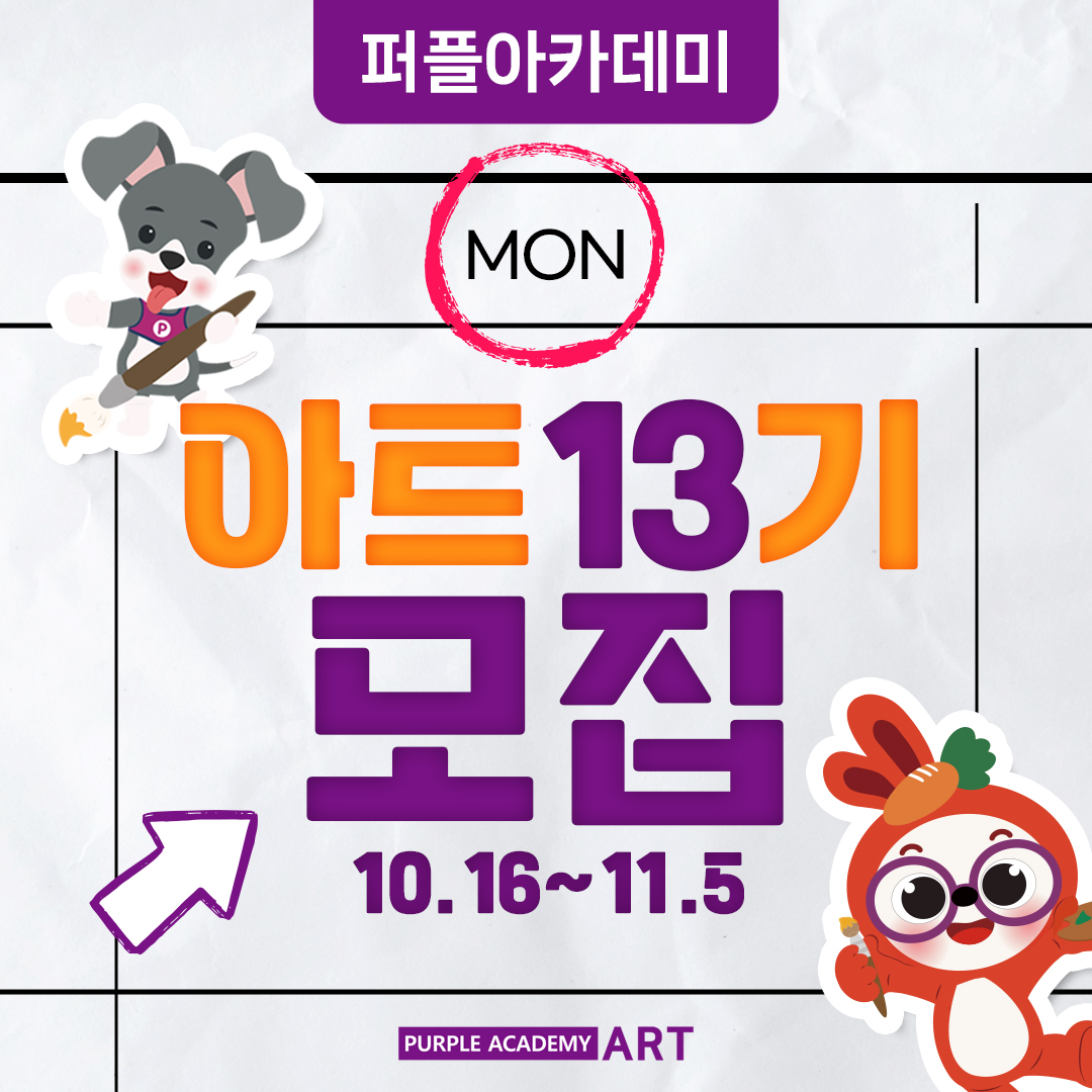 다음 주 월요일(10/16)부터 모집하는 퍼플아카데미 아트 13기 설명회가 10/17(화)에 진행될 예정입니다.