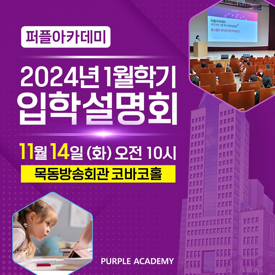11월 14일(화)에 목동방송회관 코바코홀에서 오프라인 입학설명회를 실시합니다.