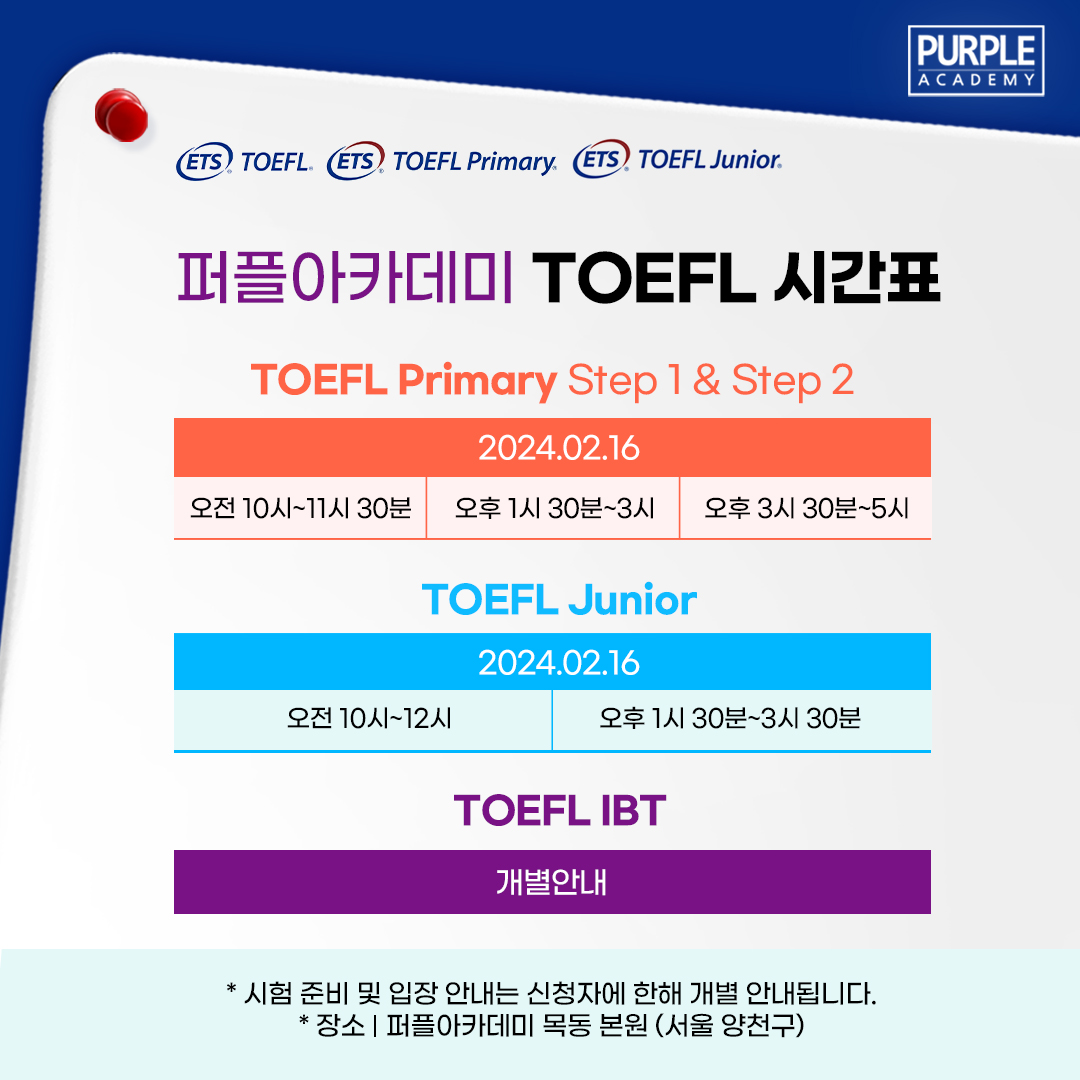 이번 7차 TOEFL Primary/Junior는 2월 16일에 시행됩니다.