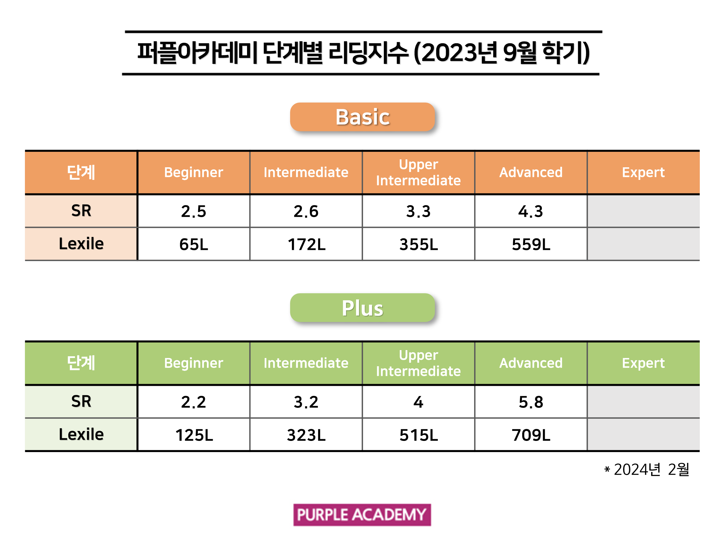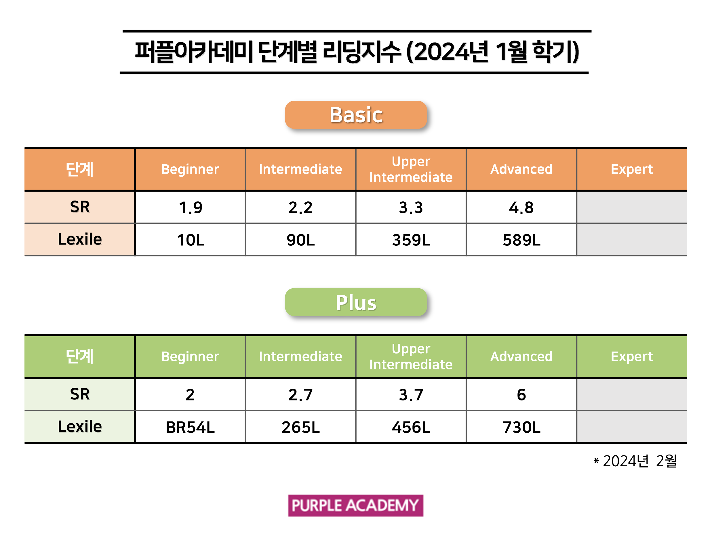 퍼플 Kids의 학기별, 단계별 2024년 2월 리딩 지수를 공개합니다!