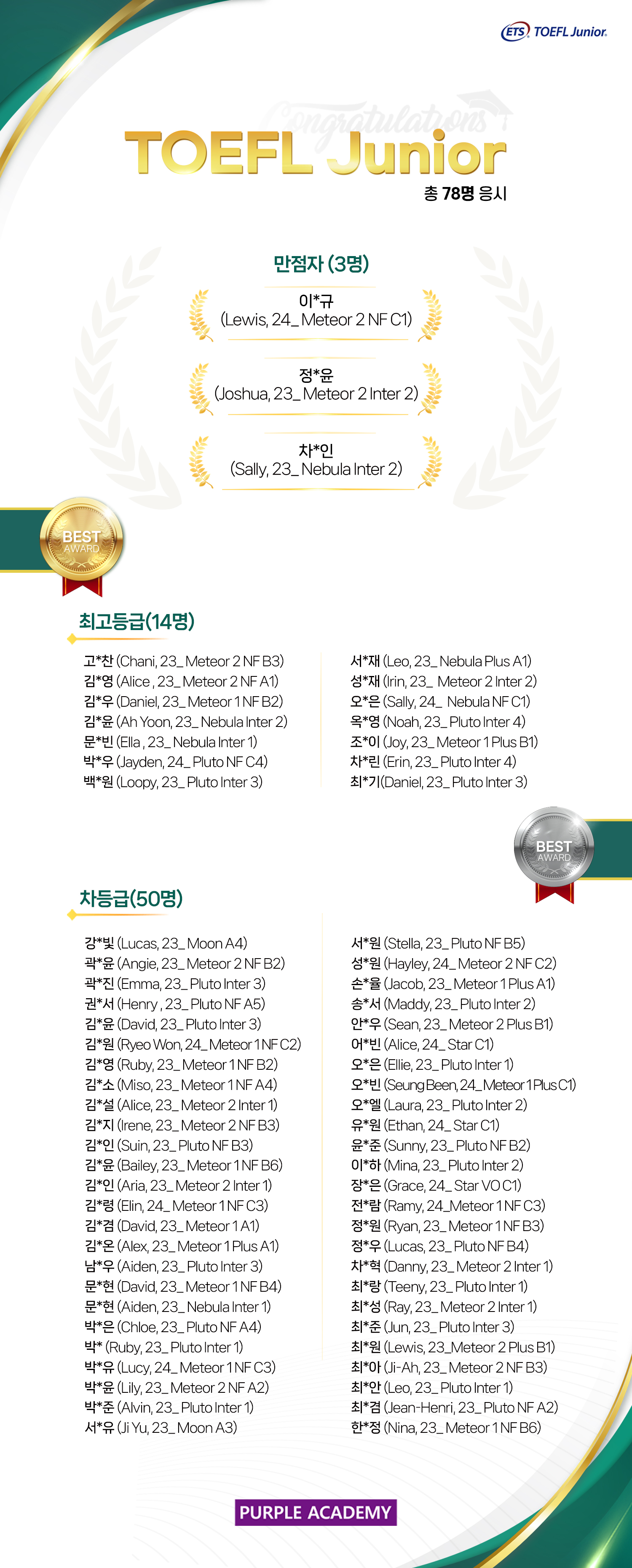 TOEFL Junior 총 78명 응시, TOEFL Primary Step 1에 18명, Step 2에 26명이 응시하였습니다.