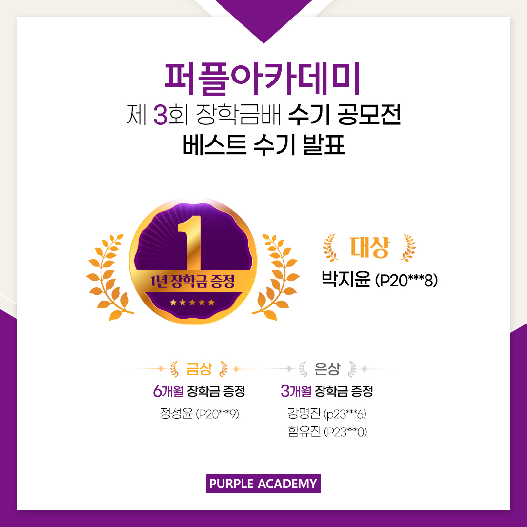 학부모님들로부터 열렬한 관심을 받았던 "퍼플아카데미 제3회 수기공모전"의 수상자를 드디어 공개합니다!