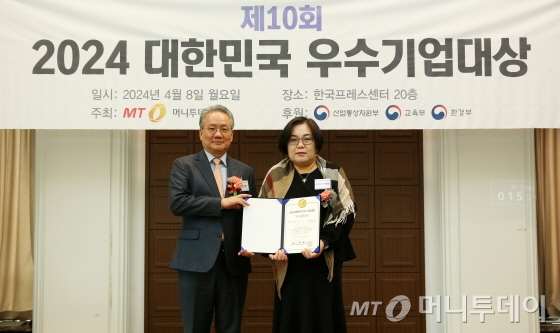 이수연 퍼플아카데미 대표(사진 오른쪽)가 8일 오후 서울 중구 한국프레스센터에서 열린 머니투데이 주최의 '2024 제10회 대한민국 우수기업대상' 시상식에서 '홈스쿨링 콘텐츠' 부문 '우수교육대상'을 수상하고 강호병 머니투데이 대표이사 사장과 기념사진을 찍고 있다.