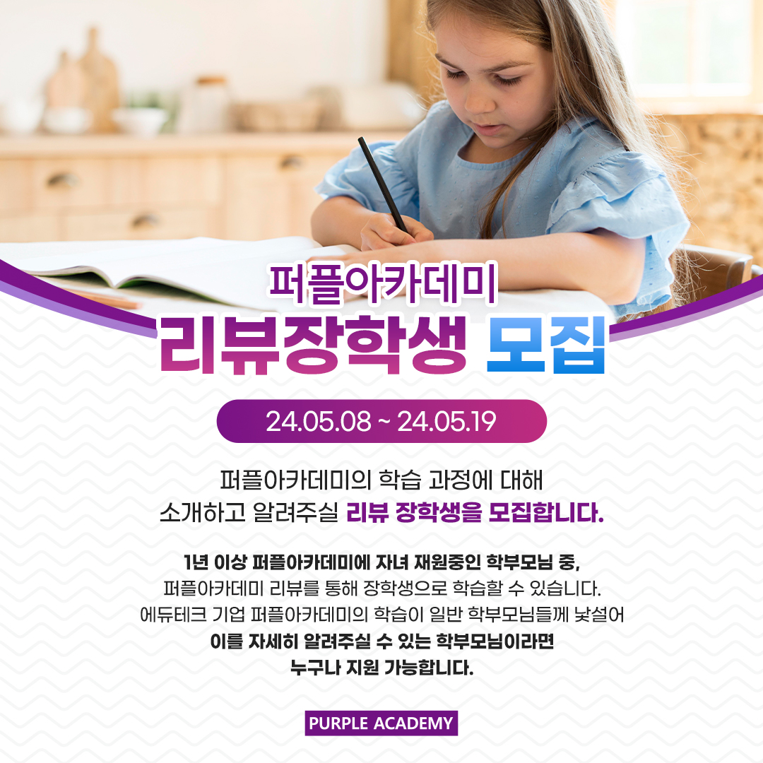 1년 이상 퍼플아카데미에 자녀 재원중인 학부모님 중, 퍼플아카데미 리뷰를 통해 장학생으로 학습할 수 있습니다.