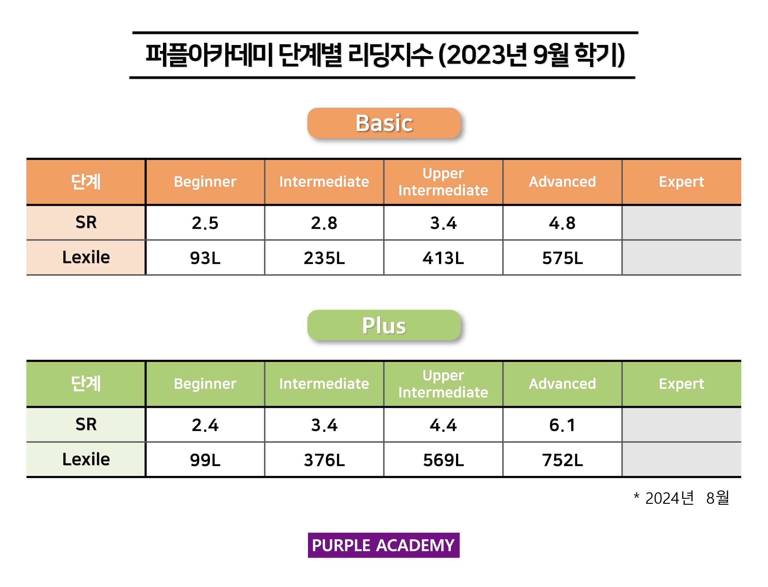 퍼플 Kids의 학기별, 단계별 2024년 8월 리딩 지수를 공개합니다!