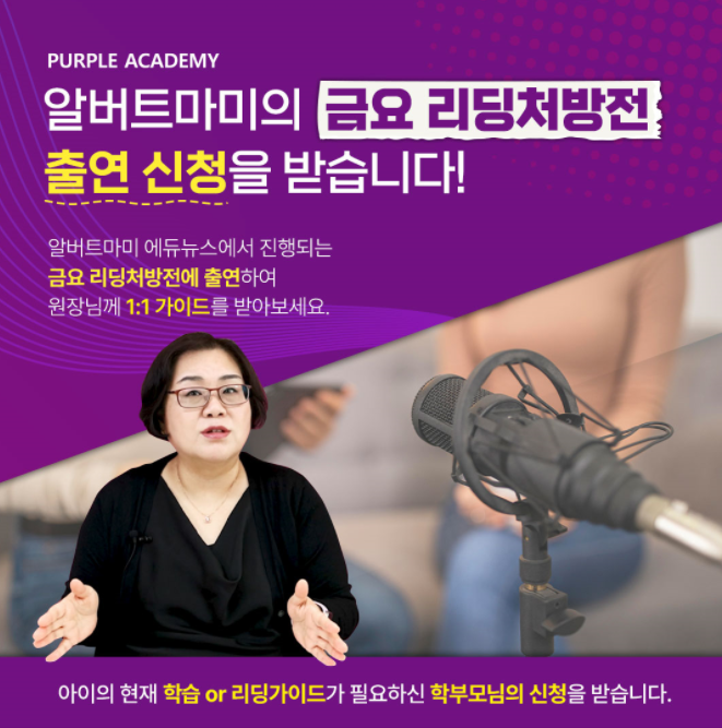 알버트마미에듀뉴스에서 진행될 [금요 리딩처방전]에 출연하여 원장님께 1:1 코칭을 받아보세요.