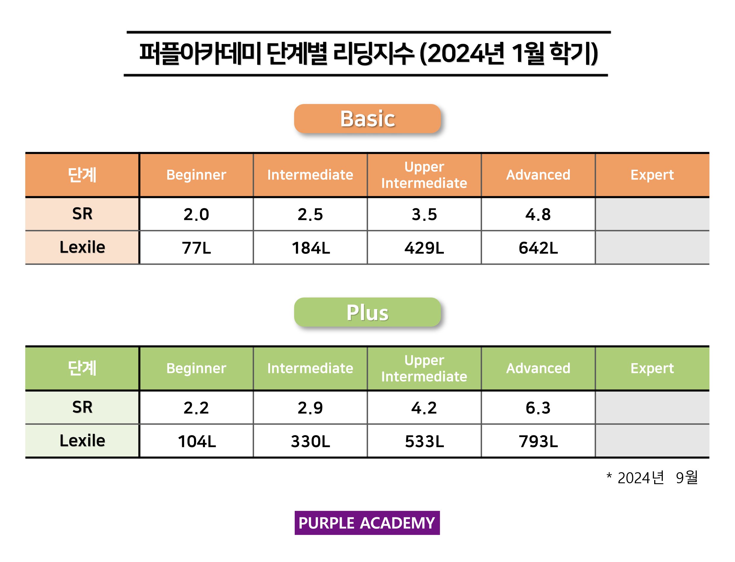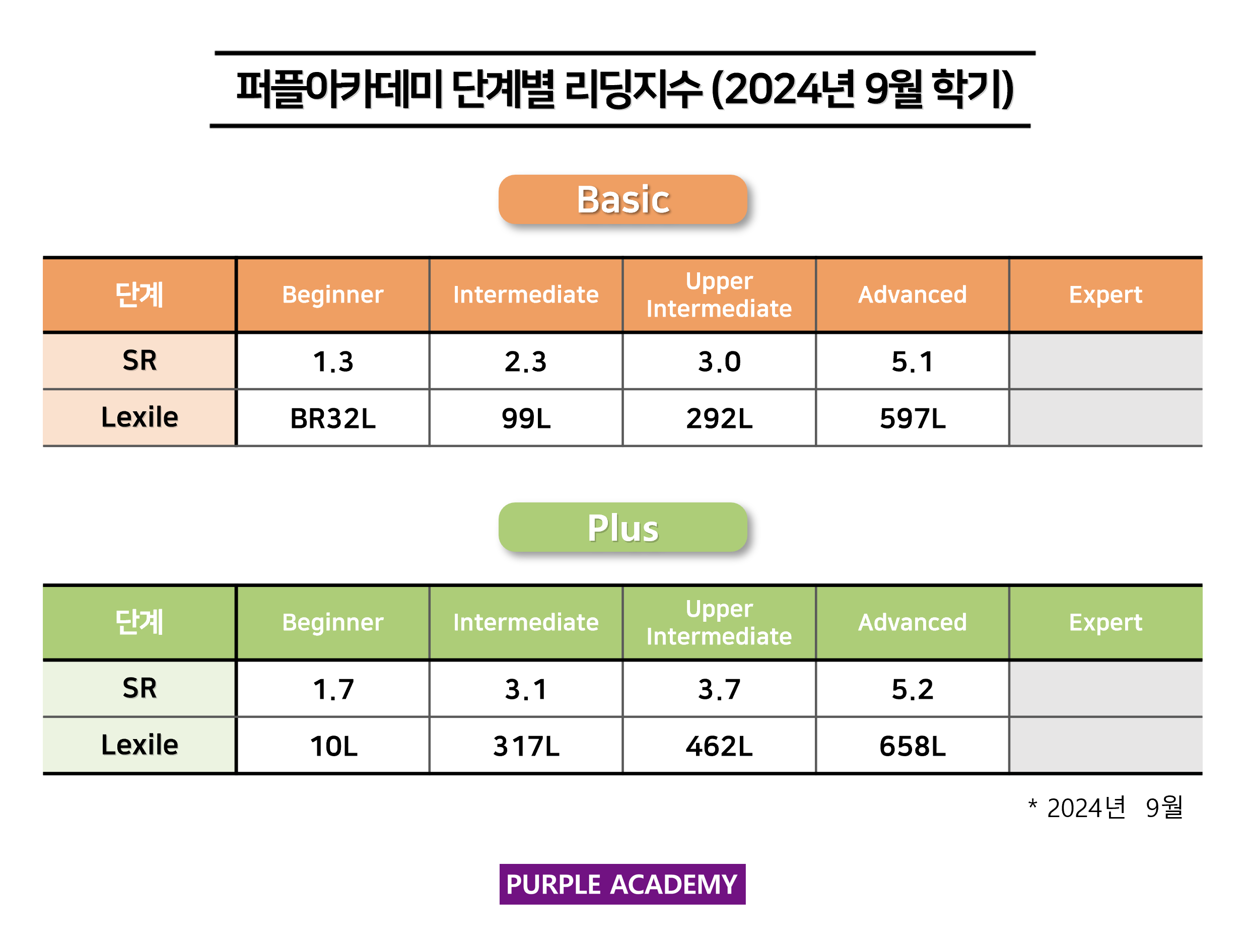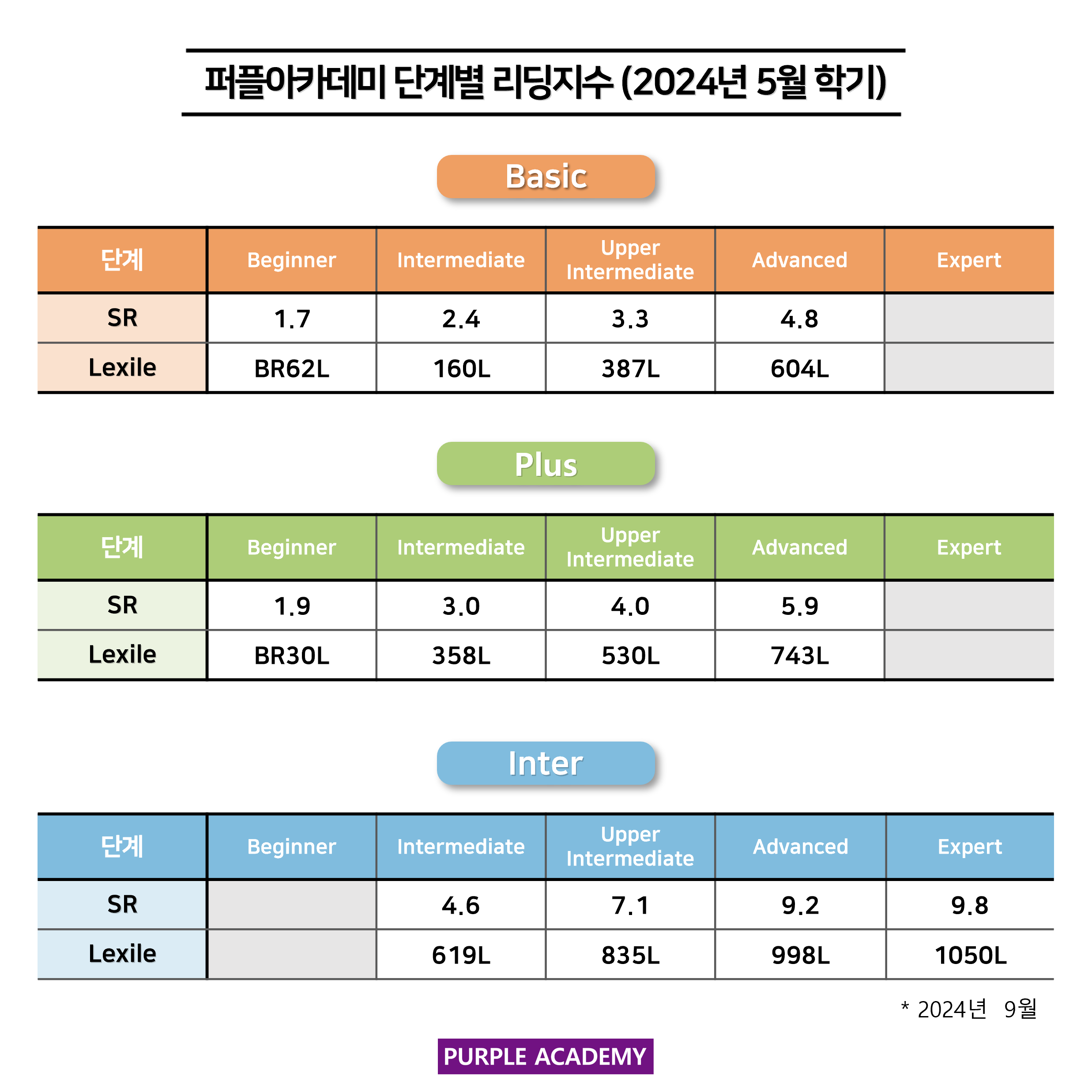 퍼플 Kids의 학기별, 단계별 2024년 9월 리딩 지수를 공개합니다!