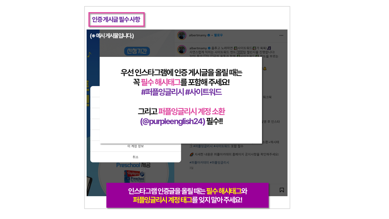 * 인스타그램 업로드 시 퍼플잉글리시 계정 (@purpleenglish24) 태그 소환 / 필수 해시태그 포함 필수