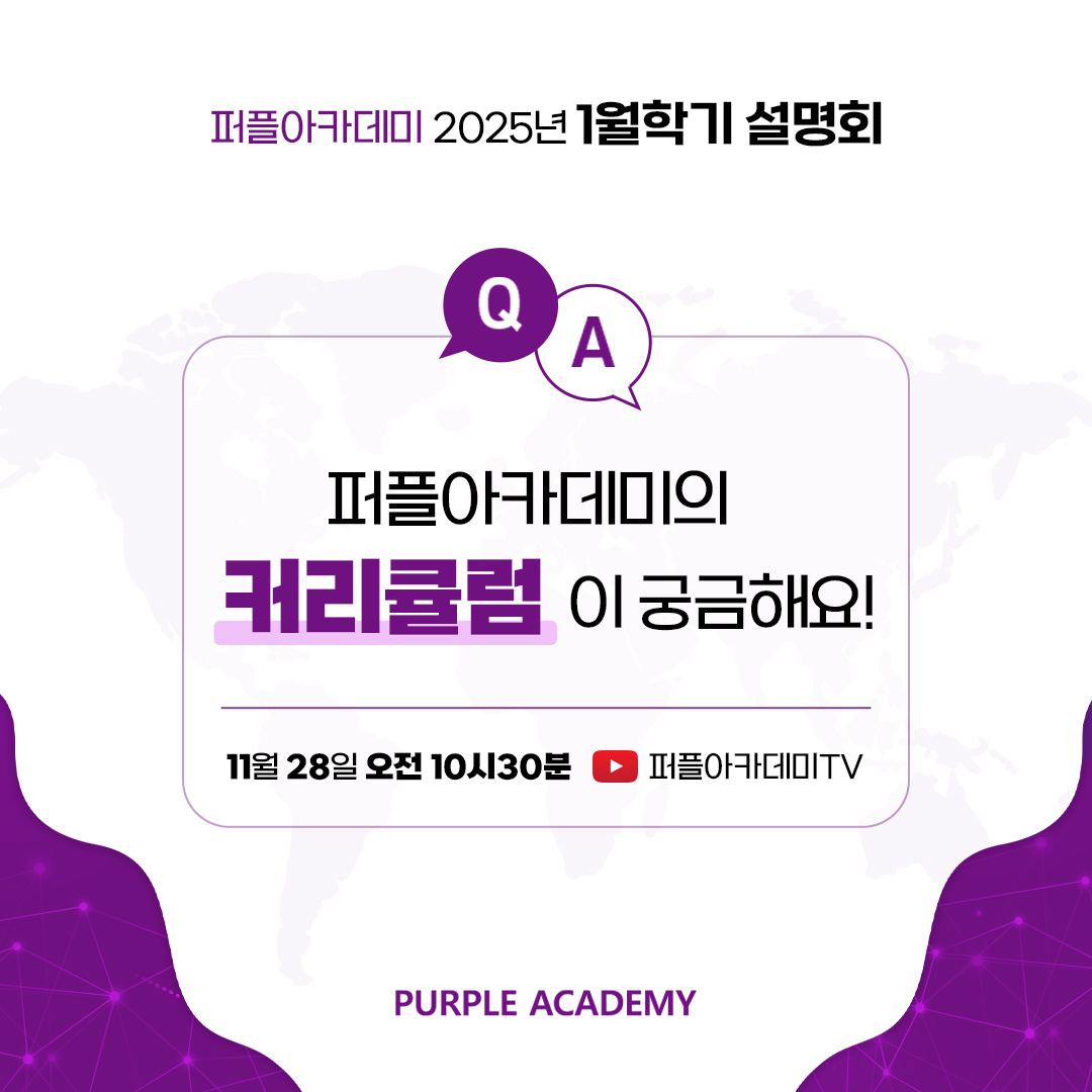 퍼플아카데미 커리큘럼에 대해 궁금했던 모든 것, 오늘 오전 10시 30분 라이브방송에서 확인해보세요.