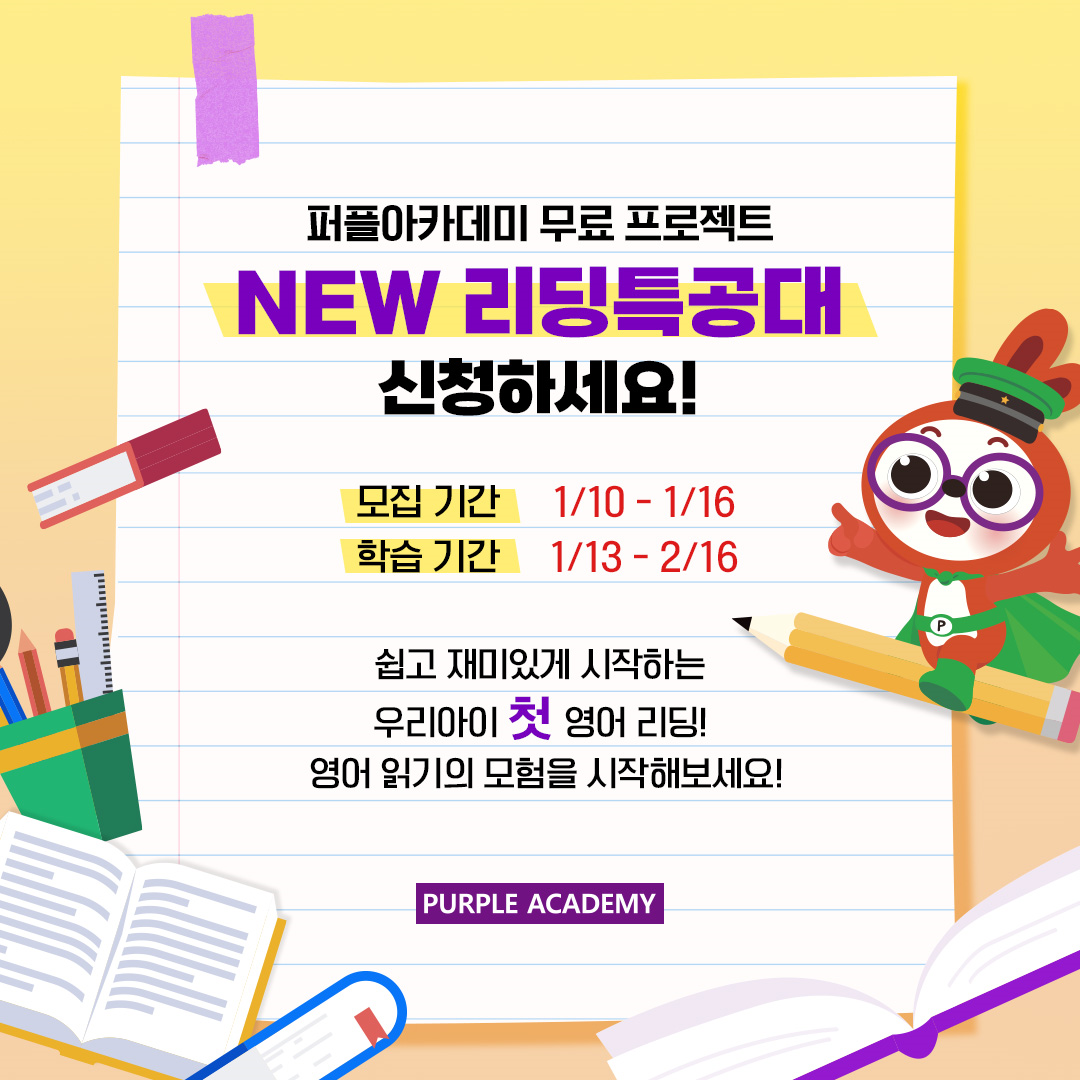- 무료 리딩특공대 신청 방법은 아래 기존 공지사항 링크를 참고해주시거나 "퍼플맘의 스마트육아 카페"에서 자세하게 안내받으실 수 있습니다.