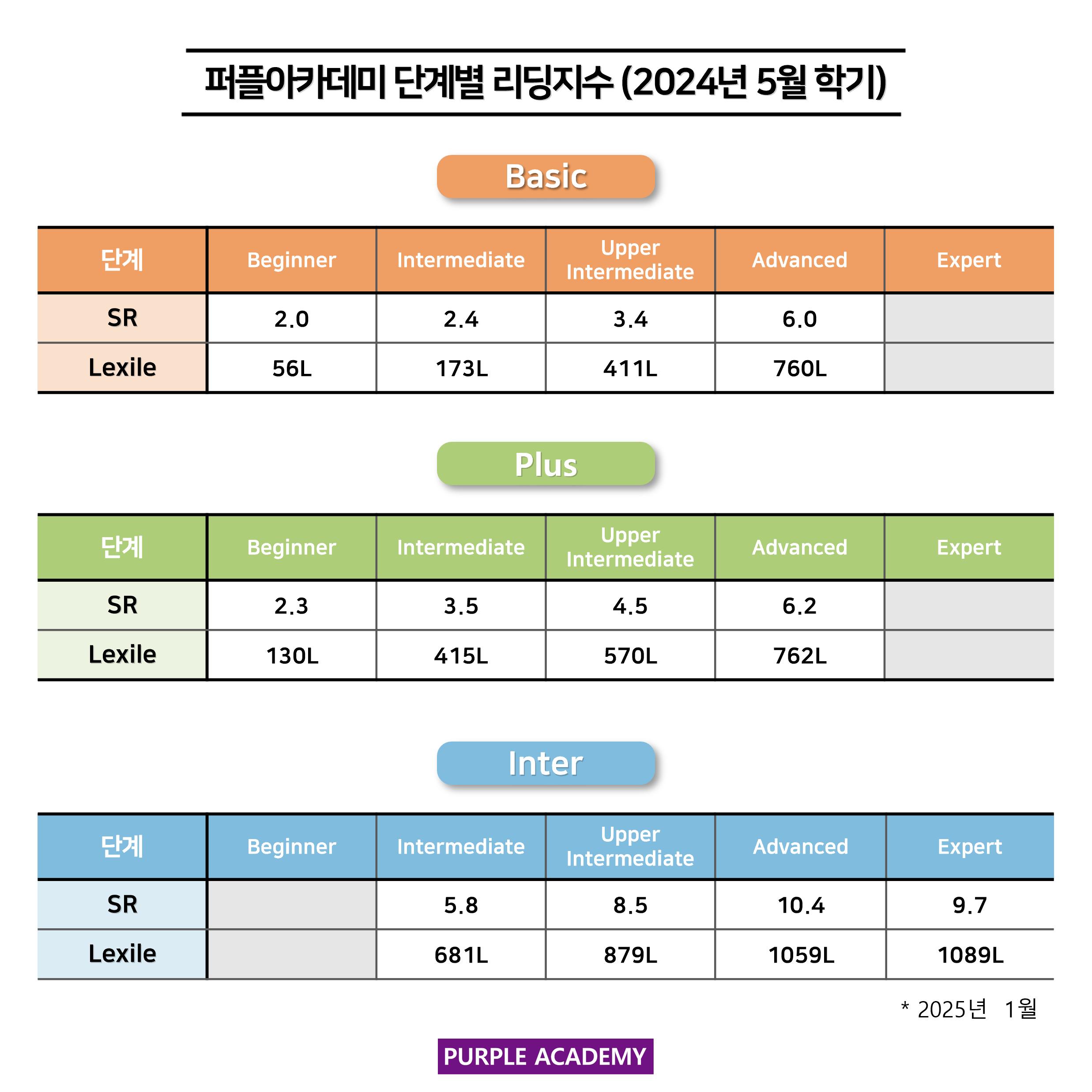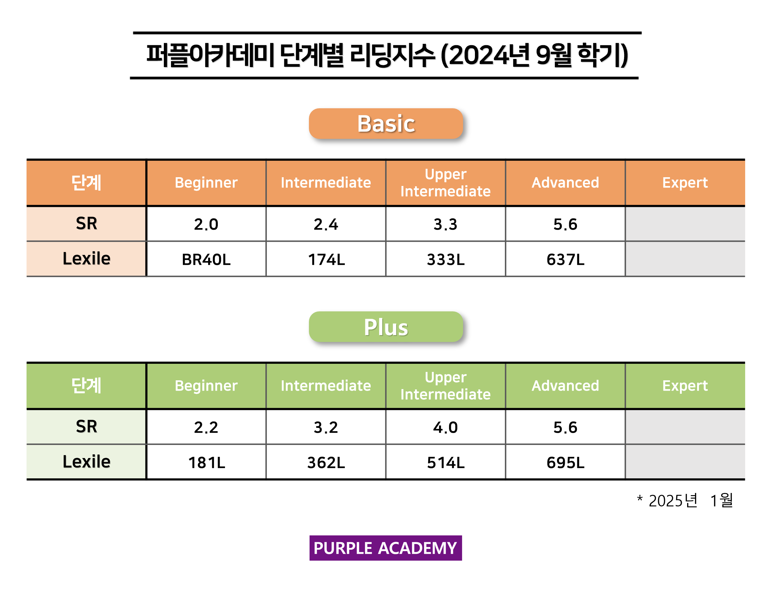 퍼플 Kids의 학기별, 단계별 2025년 1월 리딩 지수를 공개합니다!