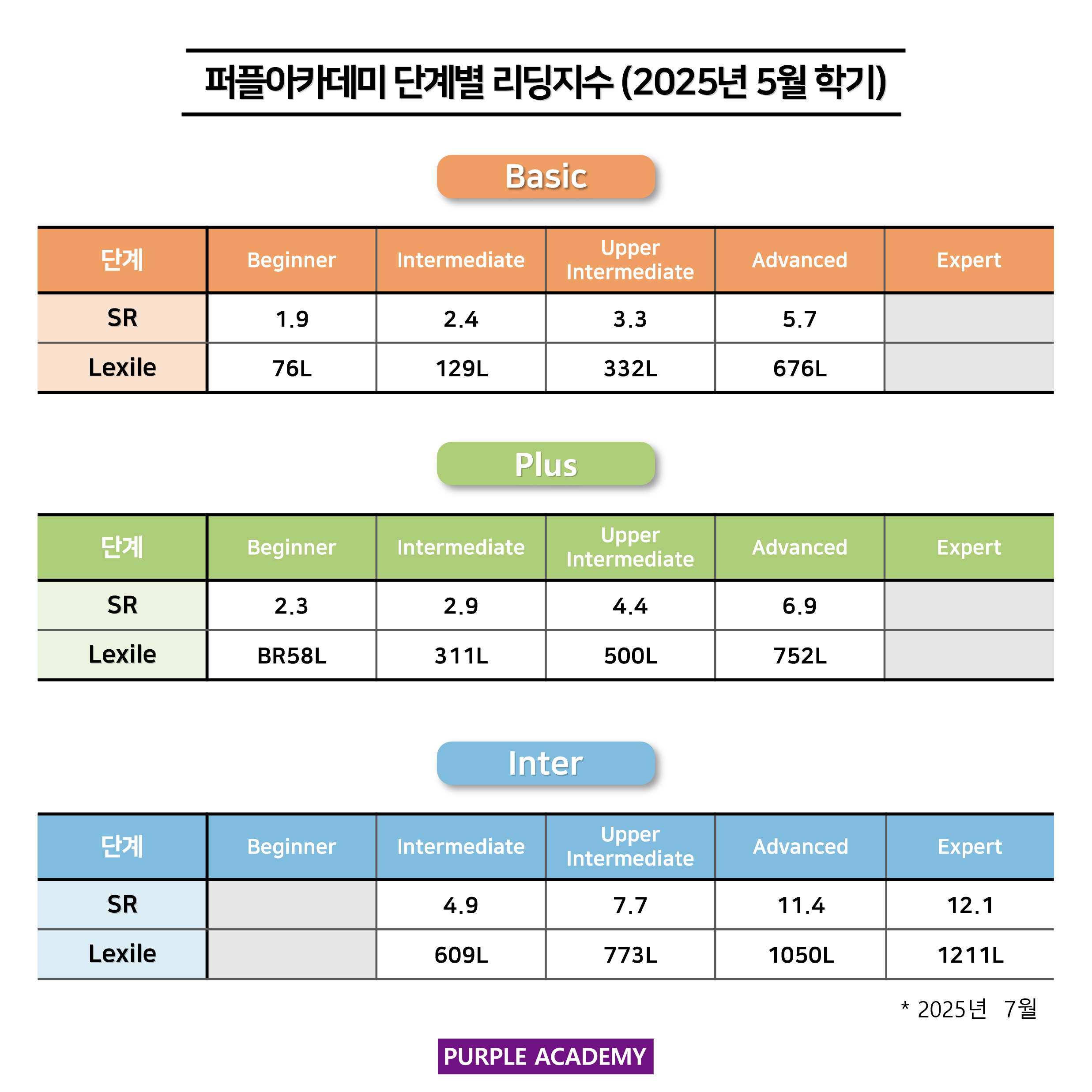 퍼플 Kids의 학기별, 단계별 2025년 7월 리딩 지수를 공개합니다!