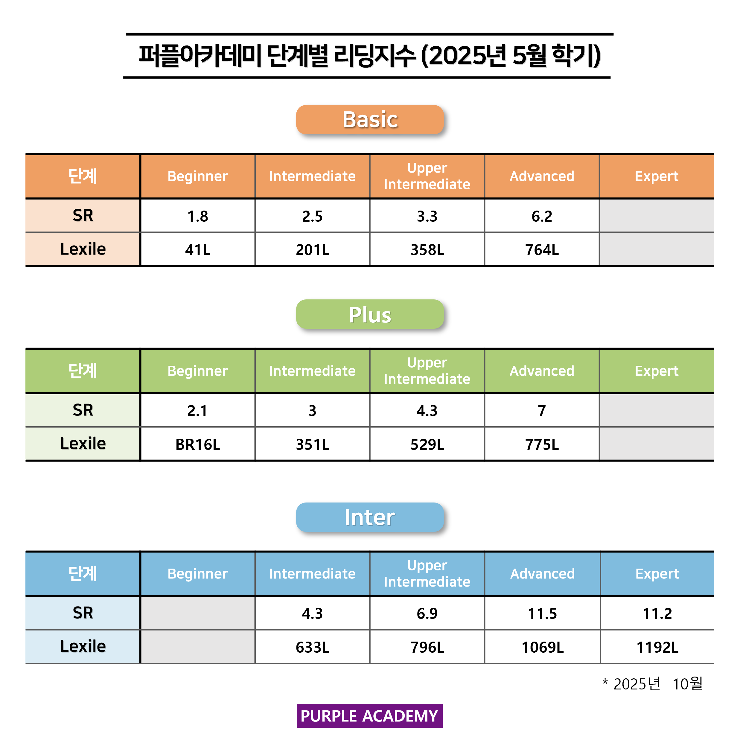 퍼플 Kids의 학기별, 단계별 2025년 10월 리딩 지수를 공개합니다!