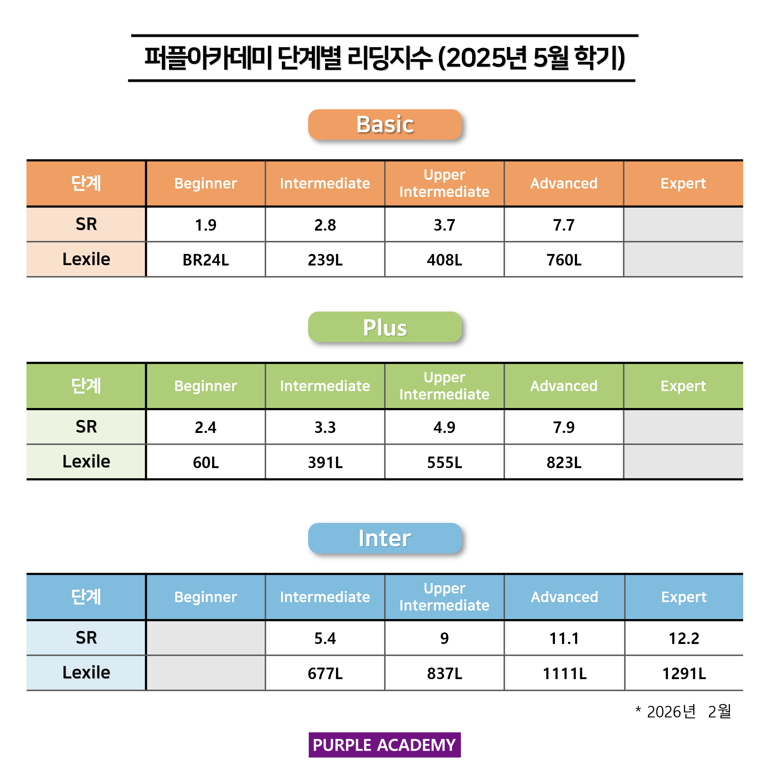 퍼플 Kids의 학기별, 단계별 2026년 2월 리딩 지수를 공개합니다!