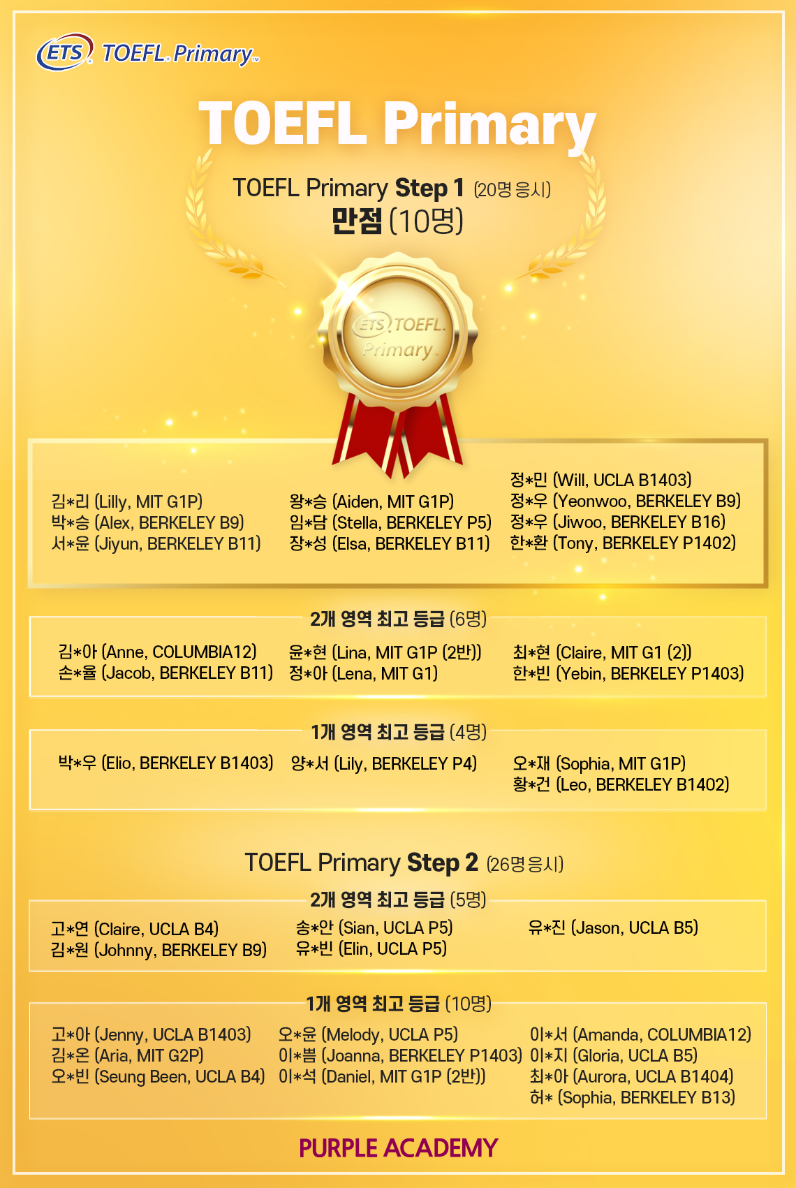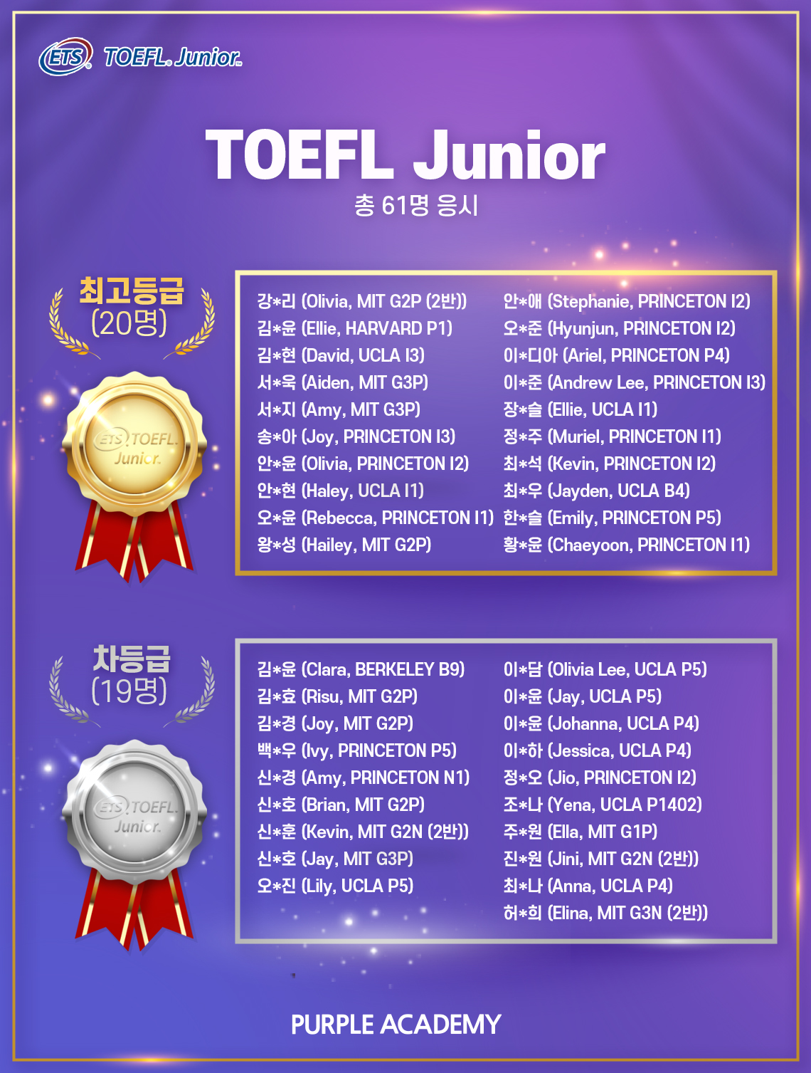 TOEFL Junior 총 61명 응시, TOEFL Primary Step 1에 20명, Step 2에 26명이 응시하였습니다.
