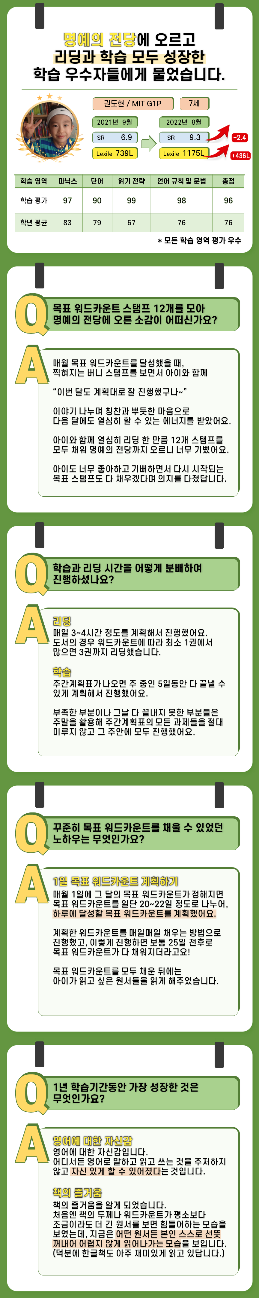퍼플아카데미 학습 우수자의 이야기를 들려드립니다!이번엔 SR 9.3, Lexile 1175L 7살 도현이의 학습 노하우!■ 부족한 학습은 주말을 활용하는게 가장 중요해요.■ 매 월 초 실현가능한 목표를 세우고 계획했어요.■ 책의 즐거움을 알고나니 조금이라도 더 길고 두꺼운 원서를 스스로 꺼내 읽는게 너무 대견해요.무엇 하나 놓칠 수 없는 그들의 노하우를 지금 만나보세요!